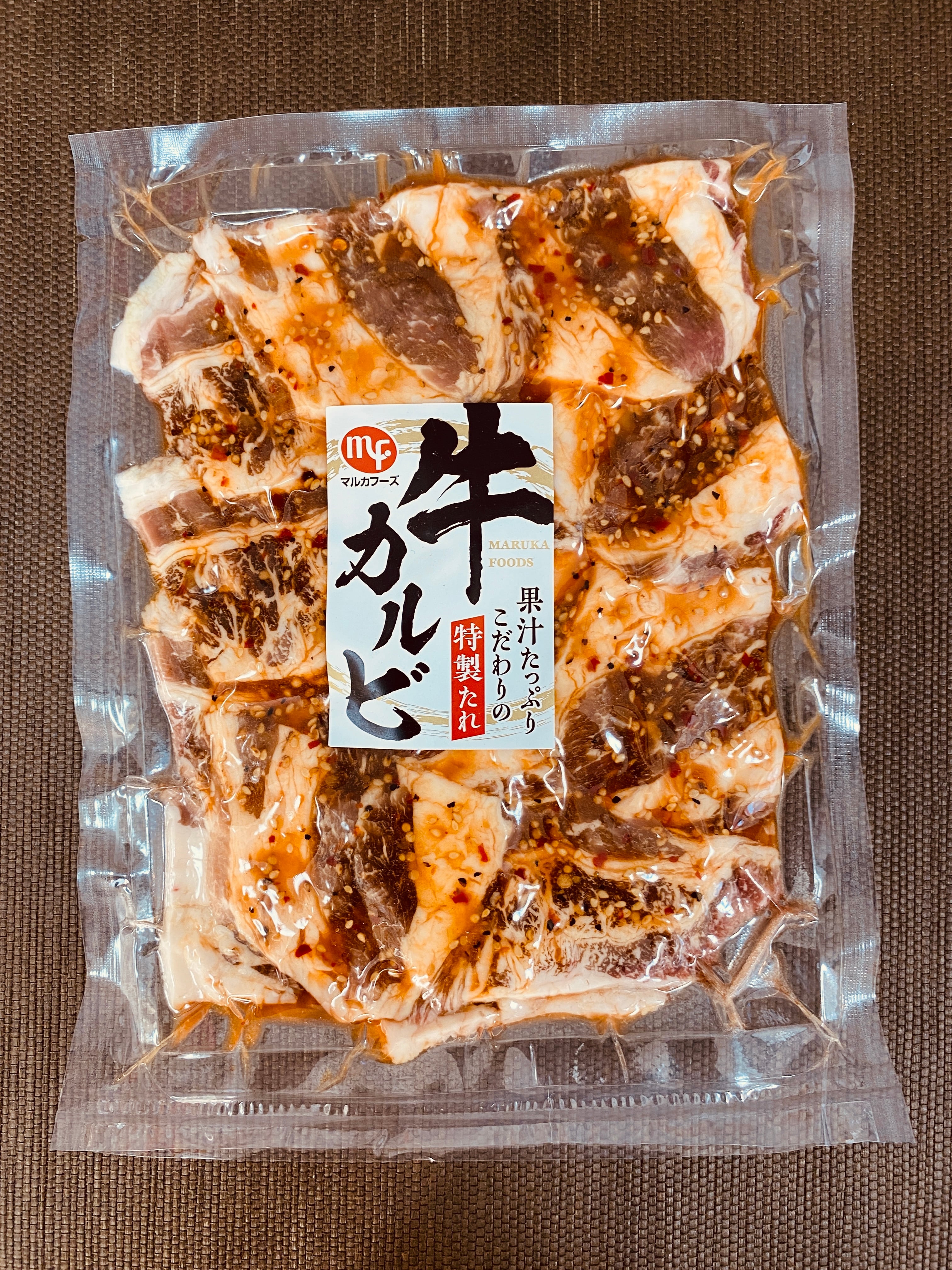 牛カルビ(アメリカ産)、醤油、砂糖、りんご果汁、にんにく、洋なし果汁、ごま、野菜エキス、レモン果汁、唐辛子、マスタード、豆板醤、こしょう、たまねぎ/増粘剤(加工デンプン)、香料、酸化防止剤(V.C)、パプリカ色素、調味料(アミノ酸等)、(一部に小麦・ごま・大豆・りんごを含む)
